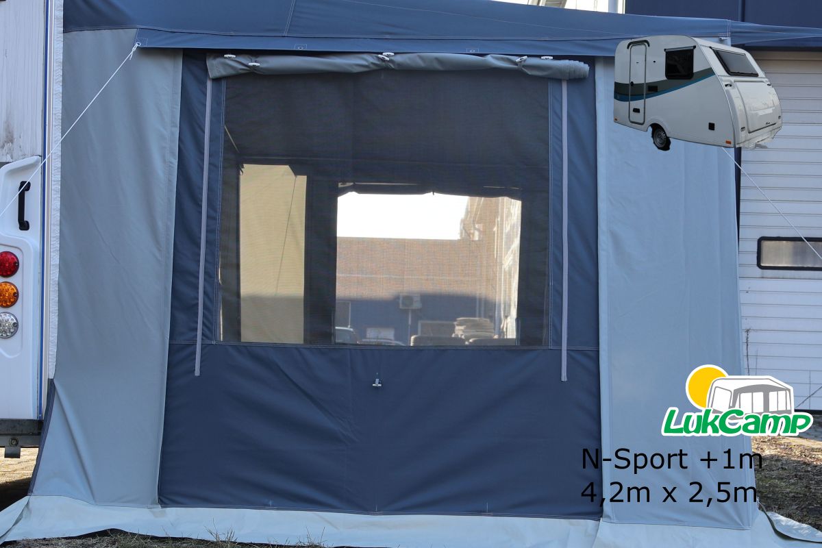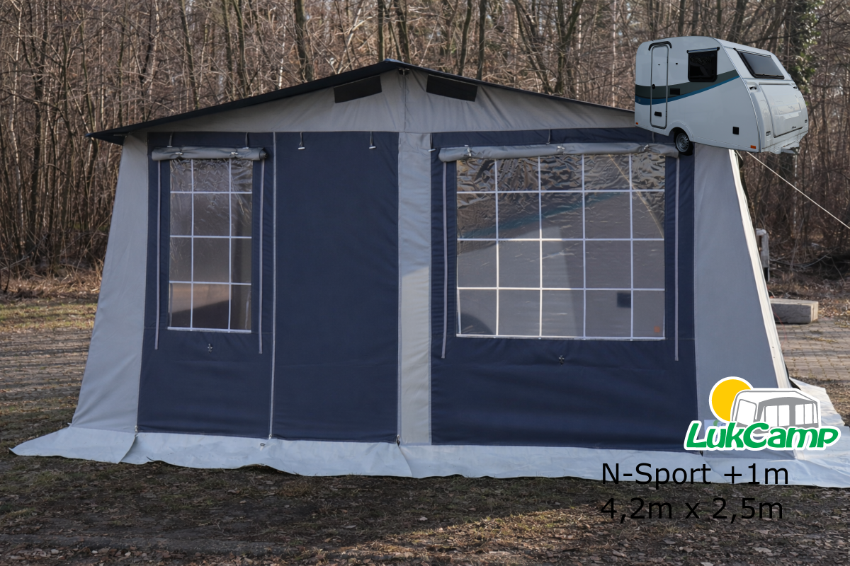 Przedsionek do przyczepy N-SPORT + 1 metr 4,2×2,5 został wykonany w wersji poszerzonej, dlatego oferuje więcej miejsca bez zwiększania głębokości konstrukcji.